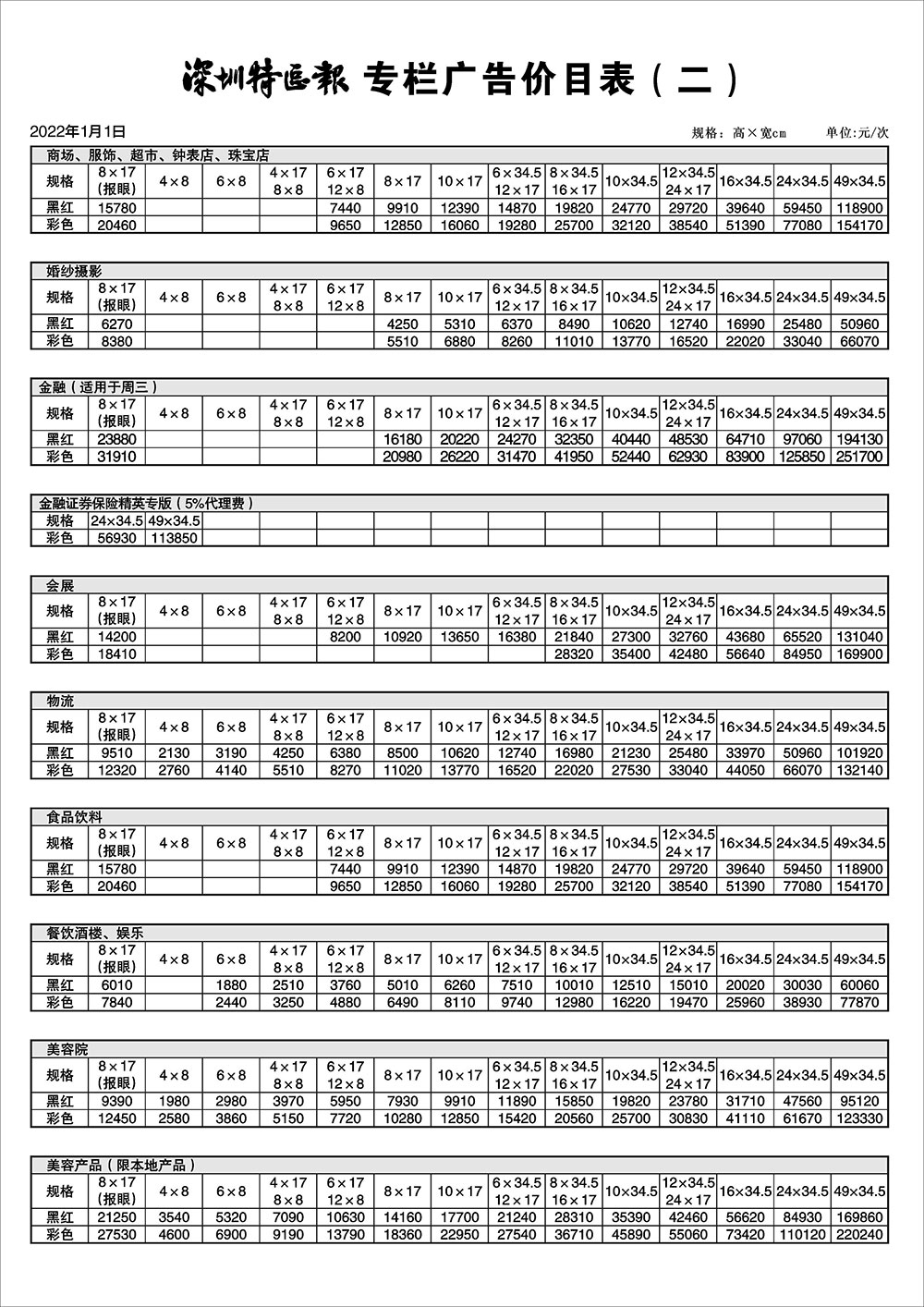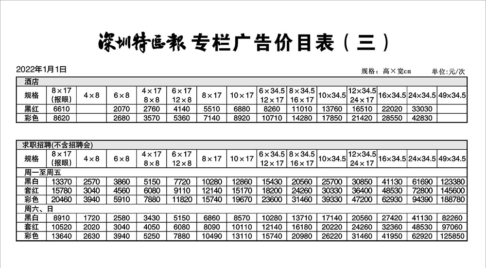 深圳特區(qū)報(bào)專(zhuān)欄廣告價(jià)目表