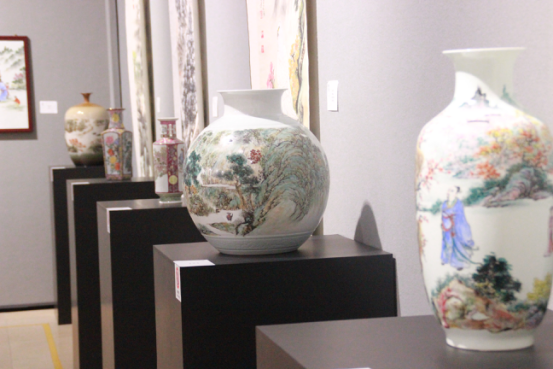 劉致遠作為國畫、廣彩陶藝大師劉群興之子,也自幼隨父學習國畫及陶瓷制作,其廣彩作品色澤鮮明,絢麗多彩,既師吸收統(tǒng)繪畫技法,又仿造西洋畫法,頗具嶺南畫派折衷中西的精髓。其國畫松樹題材的創(chuàng)作,盡顯崇山峻嶺之中,松之勁峭與水之嫵媚,其繪制的山水題材彩瓷既有山河磅礴之態(tài)勢、又具匠心細刻之精致。此次兩位嶺南畫派傳承人在此展出他們的作品,內容、風格各異,交相輝映,很好地承傳了嶺南畫派的要義。