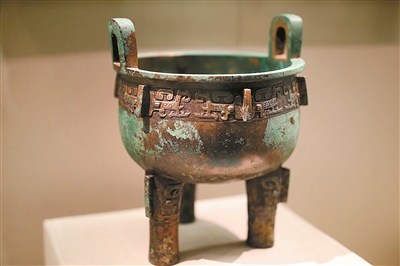 在此次展出的青銅器中,有一部分是僅銘有族氏銘文的,即家族的名號,以表示是該物品的所屬人。代表族徽的銘文,象形的程度會比較高,主要用作禮器。比如展出的鳥父甲鼎,內(nèi)里的銘文就是自上而下三個字,其中“鳥”字則幾乎完全是鳥的象形,這個鳥就是鳥族的族徽,鳥族族群在當時十分龐大。而后面兩個字就是“日名”,日名是指古人對逝人的稱謂,一般以甲乙丙丁戊己庚辛壬癸十天干前加上受祭者的輩分格式出現(xiàn)。這種禮器又叫做日名器,既點明了受祭者,又表明了作器者和受祭者的關系。