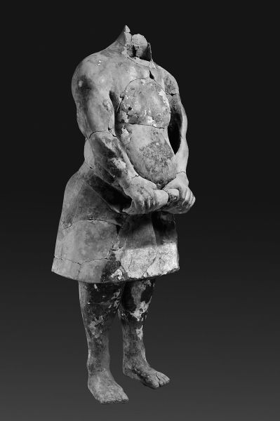 1999年,秦陵又有新驚喜——陵園東南角的百戲俑坑揭開了神秘面紗的一角。首次搶救性試掘,試掘面積僅72平方米,出土了目前在秦陵地區(qū)發(fā)現(xiàn)的體積、重量最大的一件青銅鼎以及11件陶俑。這些陶俑姿態(tài)各異,風(fēng)格、服飾、裝束等都與兵馬俑截然不同,多數(shù)上身赤裸、肌肉發(fā)達(dá),有的像持竿人,有的像角力者。經(jīng)過(guò)考證和研究,初步認(rèn)為他們可能是象征著秦代宮廷娛樂(lè)活動(dòng)的百戲俑。