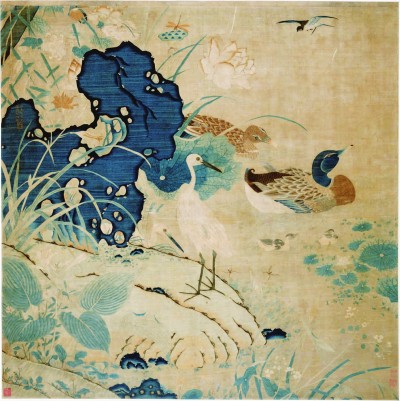 上海博物館藏朱克柔《緙絲蓮塘乳鴨圖》。