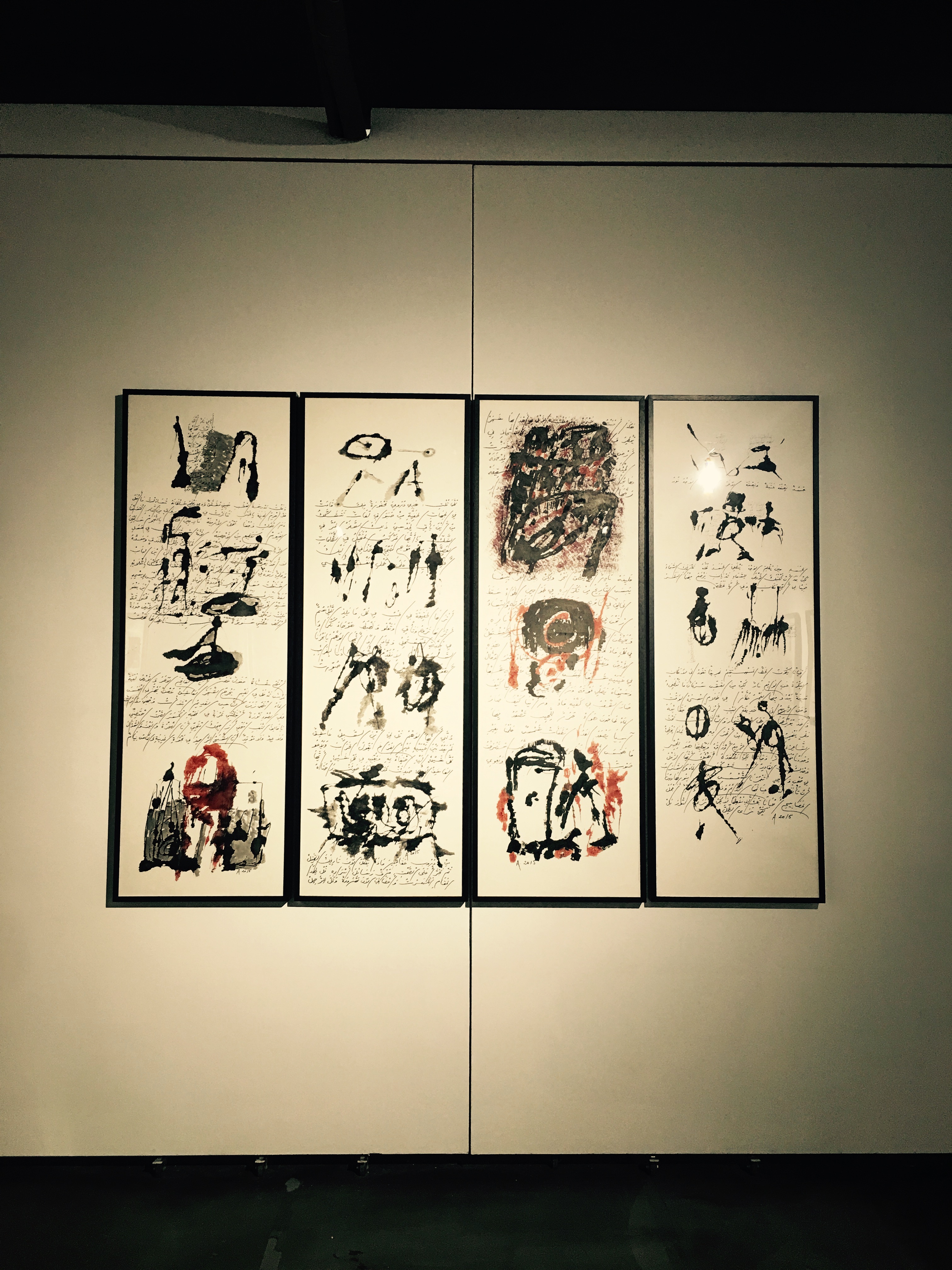 阿多尼斯的畫平靜、深邃,而又暗流涌動(dòng),光芒四射。那些騰躍于拼貼和暈染、抽象和寫意之間的效果,無論有多么率性隨機(jī)以至近乎游戲,都是那么元?dú)獬渑?,韻致飽滿,那么令人既得享酣暢淋漓的解放感,又不由自主地陷入深長(zhǎng)的回味冥思。無論是怎樣的不拘一格,僅就色彩言,黑與紅及其不同的變奏,可以說構(gòu)成了這些作品的基調(diào)。