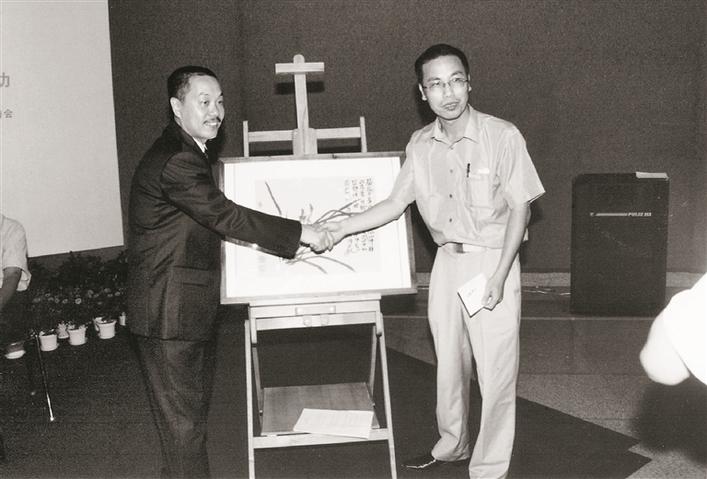 2005年7月,陳湘波(左)出席“情系災(zāi)區(qū)奉獻(xiàn)愛(ài)心——深圳市文化系統(tǒng)書(shū)畫(huà)作品賑災(zāi)義賣活動(dòng)”。
