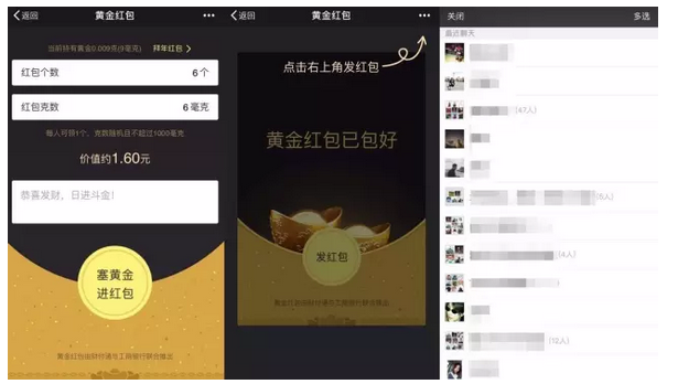 我們也可以在微信群里發(fā)紅包,基于風(fēng)險(xiǎn)控制及消費(fèi)者權(quán)益保護(hù)的相關(guān)要求,“黃金紅包”采取了一個(gè)不超過1克的限制。