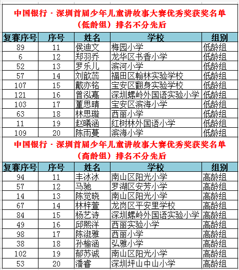 從全市近百所學(xué)校、社會(huì)賽區(qū)報(bào)名的萬(wàn)余名參賽選手中脫穎而出的選手們齊聚復(fù)賽賽場(chǎng),比賽競(jìng)爭(zhēng)異常激烈。晉級(jí)復(fù)賽的225人(其中高齡組104人,低齡組121人)使出渾身解數(shù),講述著自己喜歡的故事,最終高、低齡組每組各10人晉級(jí)決賽,低齡組新蓮小學(xué)施詩(shī)彤、鹽田區(qū)外國(guó)語(yǔ)小學(xué)申旸等10位選手,高齡組弘雅小學(xué)尹琪善、福田區(qū)翰林實(shí)驗(yàn)學(xué)校劉馨竹等10位選手“殺出重圍”,奪得決賽名額。
