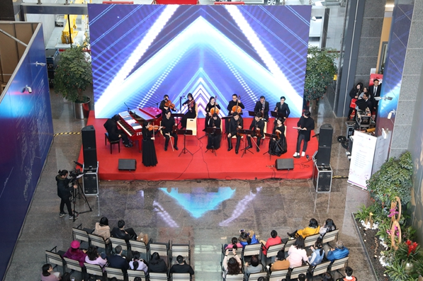 琴聲時而舒緩如流泉,時而激越如飛瀑,時而清脆如珠落玉盤,時而低回如呢喃細(xì)語……鋼琴與提琴交織,管樂和弦樂共舞,是的,你沒有聽錯,這是古典交響樂在午間響起,在福田CBD,在白領(lǐng)云集的辦公樓,在招商銀行深圳分行大廈的營業(yè)大廳里。2018年2月6日,招商銀行深圳分行大廈迎來了福田愛樂樂團(tuán)午間音樂會新年的第三場演出,也是該樂團(tuán)自2015年創(chuàng)辦午間音樂會以來的第84場演出。高雅的藝術(shù)氣息讓原本單調(diào)的午間趣味橫生,動人的場景、美妙的樂音,在這里一一定格。