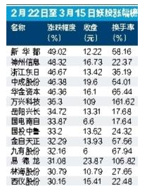 股市中有“三板成妖”一說。截至周四收盤,滬深兩市過去10個(gè)交易日,漲幅超過30%的股票有34只;過去5個(gè)交易日,漲幅超過30%的股票有15只。以上這些股票里,有一些連續(xù)上漲3個(gè)漲停以上,已經(jīng)“成妖”。那么,這些妖股有沒有一些共同點(diǎn)呢? 除少數(shù)次新股如萬興科技之外,絕大多數(shù)這類股票都經(jīng)過了一兩年下跌,股價(jià)處于低位,因這樣那樣原因得到資金關(guān)注而強(qiáng)力反彈。比如神州信息、浙江東日、中成股份、岳陽興長、國電南自、國投中魯、西儀股份等。