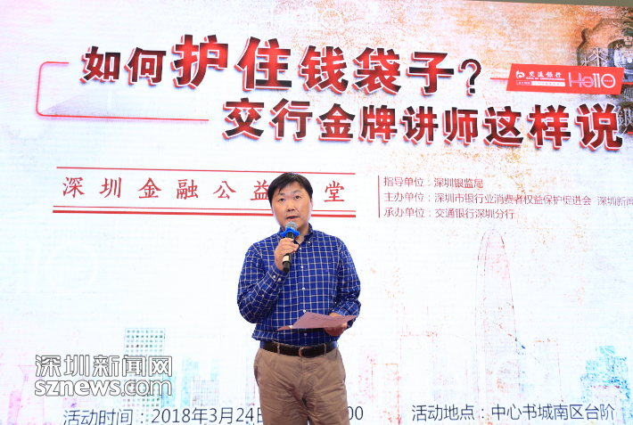 3月24日,在深圳中心書城南臺(tái)階,由深圳銀監(jiān)局指導(dǎo),深圳新聞網(wǎng)、深圳市銀行業(yè)消費(fèi)者權(quán)益保護(hù)促進(jìn)會(huì)主辦,交通銀行深圳分行承辦的大型系列公益活動(dòng)“深圳金融公益講堂”第四講如期開講?;顒?dòng)邀請了來自交通銀行深圳分行的三位金牌講師從專業(yè)角度為市民朋友們詳細(xì)講解理財(cái)知識(shí),現(xiàn)場解答市民的金融消費(fèi)困惑。