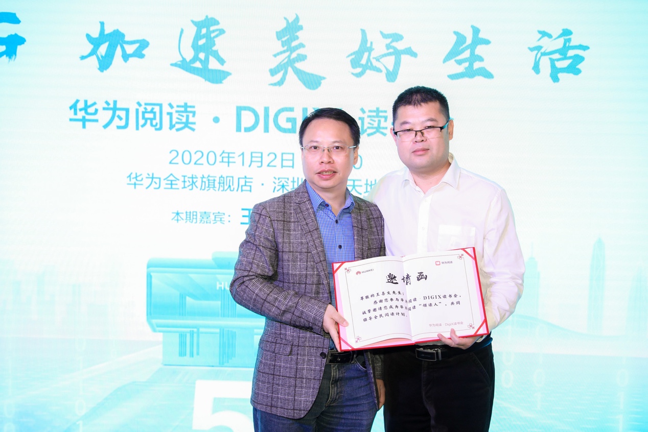 關(guān)于數(shù)字閱讀,王喜文分享道:“數(shù)字閱讀讓用戶在網(wǎng)上獲取圖書的途徑大大增加,手機(jī)閱讀讓閱讀環(huán)境變得不受限制,還可以互相交流、分享觀點(diǎn)。目前,我自己使用的就是華為手機(jī),作為一名花粉,我經(jīng)常在華為閱讀上看書。華為閱讀利用DIGIX讀書會(huì)的平臺(tái)建立了線上線下互動(dòng)交流平臺(tái),讓作者與讀者進(jìn)行零距離交流互動(dòng),我個(gè)人認(rèn)為非常有意義”。譚東暉表示:“在如今移動(dòng)互聯(lián)網(wǎng)時(shí)代,每個(gè)人都已經(jīng)可以借助手機(jī),擁有自己的隨身圖書館。華為閱讀APP,正是用更多精品的內(nèi)容和優(yōu)質(zhì)的服務(wù),為年輕人打造的高品質(zhì)移動(dòng)閱讀平臺(tái)”。周寶東則認(rèn)為:“現(xiàn)代人的閱讀方式早已從傳統(tǒng)紙質(zhì)拓展到電子書籍,甚至有聲讀物,科技的發(fā)展成就了更加便捷的閱讀方式?!蓖瑫r(shí),2020新年之際,王喜文還為現(xiàn)場(chǎng)讀者推薦了書籍《機(jī)器人革命》、周寶東推薦《5G為人工智能與工業(yè)互聯(lián)網(wǎng)賦能》與《中國需要工業(yè)精神》、譚東暉推薦《只有一個(gè)人生》,在新的一年里,助力大家實(shí)現(xiàn)閱讀Flag,讓更多的用戶能感受全新的數(shù)字閱讀體驗(yàn)。