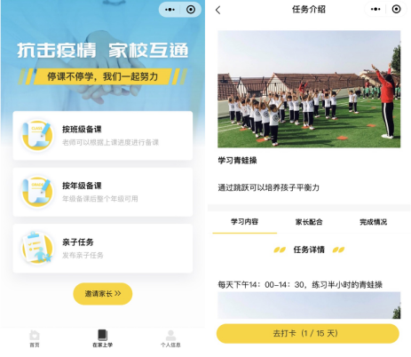 為此,“學(xué)子通”上線了“在家上學(xué)”功能,老師們可根據(jù)實(shí)際需要,選擇“按班級(jí)備課”或“按年級(jí)備課”,針對(duì)班級(jí)或年級(jí)將錄制好的備課內(nèi)容,如防疫小知識(shí)、親子閱讀、親子游戲等內(nèi)容上傳到“在家上學(xué)”模塊,讓孩子“宅”在家中也不停止學(xué)習(xí)的腳步。此外,老師還可通過設(shè)置親子小任務(wù),如一起做青蛙操、讀讀繪本小故事和親子手工藝等,讓家長和學(xué)生一起參與,并可設(shè)置打卡,調(diào)動(dòng)起學(xué)生的學(xué)習(xí)興趣,既增加親子感情,又讓學(xué)生開展室內(nèi)鍛煉活動(dòng)、開展課外閱讀,保持良好的身體狀態(tài),讓宅在家中的假期生活變得豐富。