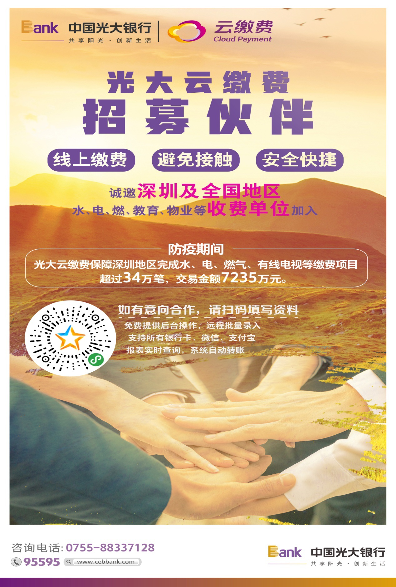見圳客戶端·深圳新聞網(wǎng)2月26日訊 守望相助,共克時(shí)艱。面對(duì)新型冠狀病毒疫情防控的緊張形勢,為有效阻斷病毒傳播渠道,光大銀行深圳分行積極響應(yīng)國家號(hào)召,充分發(fā)揮云繳費(fèi)線上便民繳費(fèi)服務(wù)優(yōu)勢,全力保障全國,特別是重點(diǎn)地區(qū)水、電、燃等主要生活繳費(fèi)線上通道穩(wěn)定暢通運(yùn)行,足不出戶,完成各類繳費(fèi),最大限度降低了居民的出行風(fēng)險(xiǎn),全面助力打贏“防疫”阻擊戰(zhàn)。