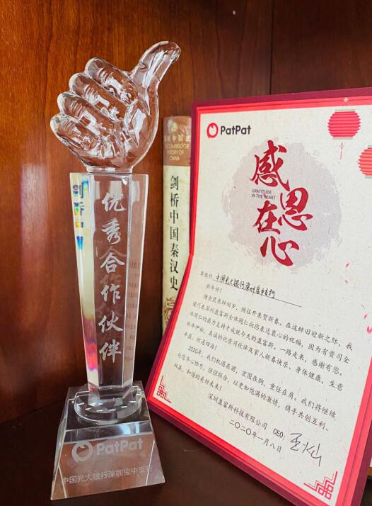 深圳新聞網(wǎng)3月16日訊 2020年新春伊始,光大銀行深圳寶中支行收到來(lái)自PATPAT平臺(tái)發(fā)來(lái)的感謝信,榮獲PATPAT平臺(tái)頒發(fā)的“優(yōu)秀合作伙伴”獎(jiǎng)。