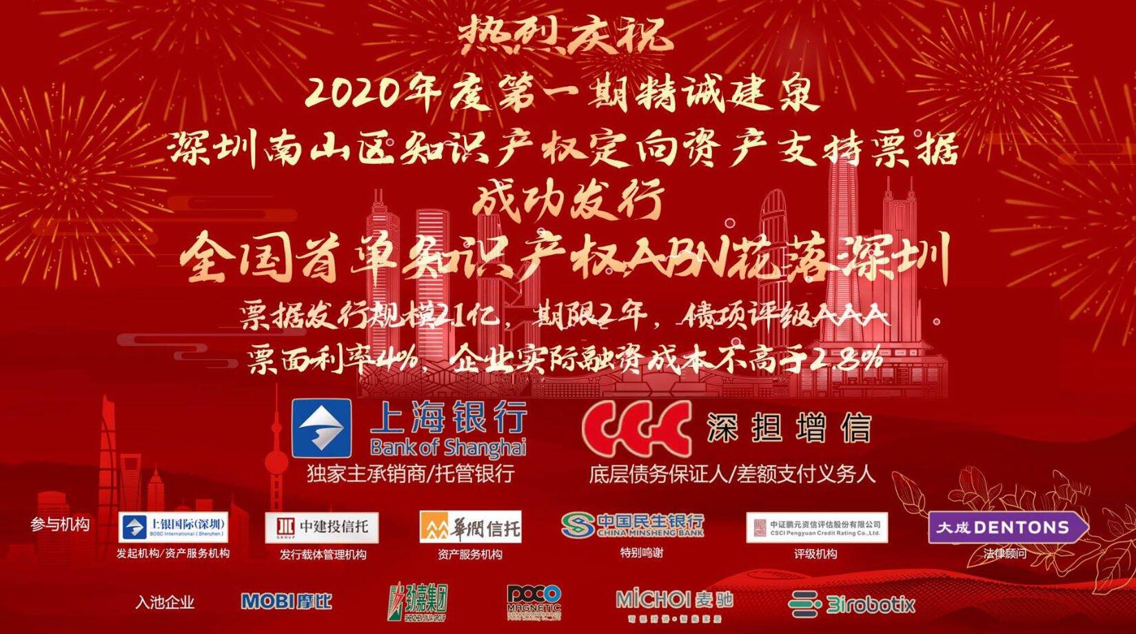深圳新聞網(wǎng)·見圳客戶端2020年9月23日訊 昨日,隨著上海銀行股份有限公司主承的“上銀國際投資(深圳)有限公司2020年度第一期精誠建泉深圳南山區(qū)知識(shí)產(chǎn)權(quán)定向資產(chǎn)支持票據(jù)”成功發(fā)行,中國銀行間交易商協(xié)會(huì)首單民營科技中小企業(yè)專項(xiàng)知識(shí)產(chǎn)權(quán)ABN項(xiàng)目花落深圳。該項(xiàng)目不僅是對(duì)知識(shí)產(chǎn)權(quán)證券化的一次創(chuàng)新和實(shí)踐,也為中小民營科技企業(yè)開辟了一條在銀行間市場融資的新渠道。本期ABN共五家入池企業(yè),發(fā)行規(guī)模2.1億元,期限兩年,票面4%,經(jīng)南山區(qū)政府補(bǔ)貼和深圳擔(dān)保集團(tuán)費(fèi)用減免,入池企業(yè)實(shí)際融資成本低于年化2.80%。 一直以來,上海銀行以“精誠至上,信義立行”為核心價(jià)值觀,堅(jiān)持“融智”與“融資”有機(jī)結(jié)合,以實(shí)體經(jīng)濟(jì)需求為導(dǎo)向,不斷推進(jìn)產(chǎn)品創(chuàng)新,持續(xù)為實(shí)體經(jīng)濟(jì)發(fā)展提供更高質(zhì)量、更有效率的金融服務(wù)。此次首單知識(shí)產(chǎn)權(quán)ABN項(xiàng)目花落深圳,不僅是深圳不斷強(qiáng)化金融創(chuàng)新所取得的重要成果,更是上海銀行探索服務(wù)深圳、服務(wù)實(shí)體經(jīng)濟(jì)新模式的重要實(shí)踐。