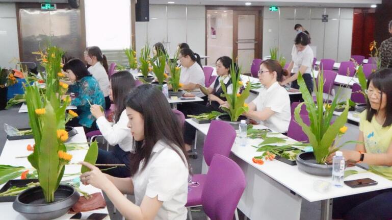 活動現(xiàn)場,馮老師詳細介紹了傳統(tǒng)花藝的歷史文化、插花造型、色彩搭配、器具應用等基礎知識,從花語寓意、花材修剪、構圖等方面深入淺出的講解插花的要點。在悠然的花香浸染間,輕柔的音樂熏陶中,大家按照馮老師展示的步驟,將花朵、樹葉精心剪裁、混搭、點綴成束,將一朵一朵鮮花、綠葉錯落有致地插在花盆中里,普通的花葉、枝條,經(jīng)過大家精巧的修飾與加工之后,變成了令人賞心悅目的藝術品。整個會場花香四溢,歡聲笑語,充滿了輕松歡快的氛圍。