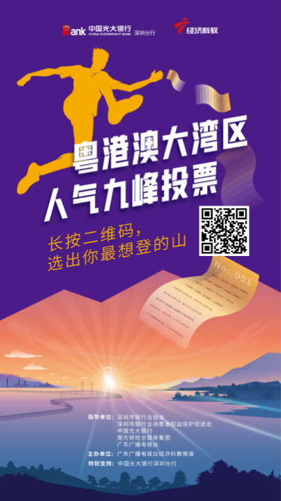 近日,“2021粵港澳大灣區(qū)全民登高系列賽”已經(jīng)進(jìn)入啟動(dòng)階段,現(xiàn)已在網(wǎng)上發(fā)起粵港澳大灣區(qū)人氣九峰的投票,通過(guò)各大網(wǎng)友從29座粵港澳大灣區(qū)山峰中票選出九座人氣最高的山峰,作為本次全民登高系列賽線(xiàn)上賽的主要場(chǎng)地,并在其中一座山峰舉行線(xiàn)下賽事活動(dòng)。廣大市民朋友可通過(guò)掃描圖中二維碼進(jìn)行投票。