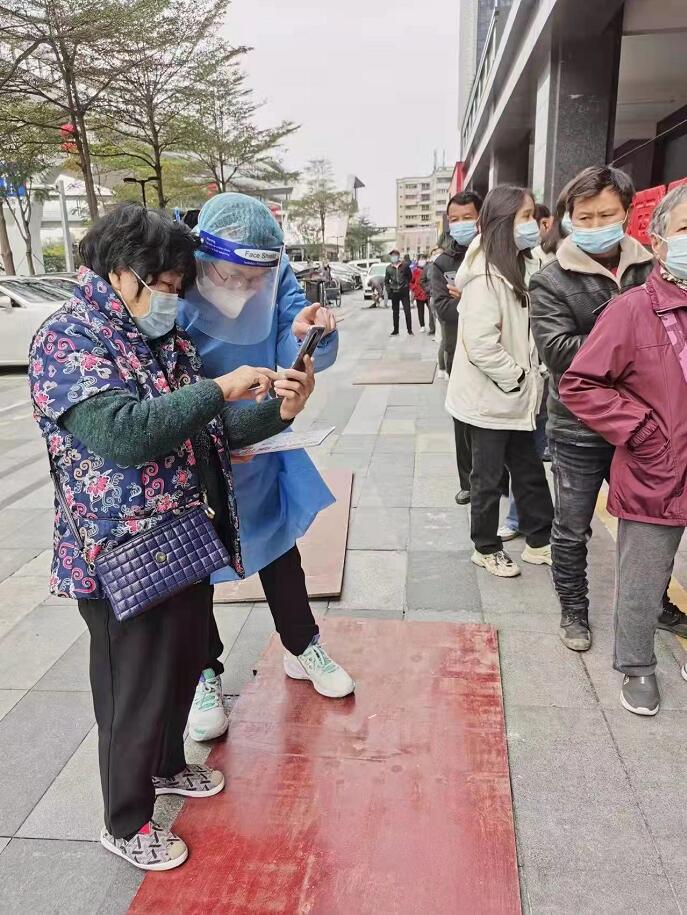 2月17日,景華社區(qū)公園核酸篩查檢測點。面對大量參與核酸檢測的市民,青年志愿者耐心做好指引解釋,指導(dǎo)群眾掃碼、采集信息,教居民操作檢測小程序,開展防疫宣傳,維護現(xiàn)場秩序,保障核酸檢測工作井然有序進行。因核酸檢測點在居民區(qū),老年人較多,對核酸檢測登記小程序操作流程不熟悉,再加上是夜晚檢測,現(xiàn)場光線不足,給服務(wù)工作帶來一些難題,但青年志愿者們沒有退縮,而是拿出在工作中服務(wù)客戶的勁頭,更細(xì)致、更耐心解決問題,做好志愿服務(wù)。