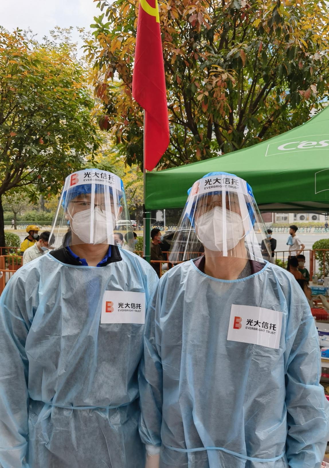 光大信托深圳區(qū)域黨支部在接到協(xié)同抗疫通知后,第一時間組織黨員和員工積極報名參與志愿服務(wù)。3月5日,恰逢毛澤東主席“向雷鋒同志學習”題詞的紀念日,光大信托公司風險總監(jiān)姚恒民同志以年近6旬的高齡,率先垂范的沖在一線,帶領(lǐng)深圳區(qū)域黨員同志們,投入福田區(qū)蓮花街道獅嶺社區(qū)的核酸檢測志愿服務(wù)工作,用實際行動和赤誠情懷書寫共產(chǎn)黨員的責任和擔當。當天天氣炎熱,太陽暴曬下穿著防護服兩個小時工作下來,全身已完全濕透,但他們以飽滿的激情、負責任的態(tài)度詮釋了一個共產(chǎn)黨員在黨旗下宣誓的誓言。光大信托的一位黨員同志說:“疫情就是命令,防控就是責任,崗位就是戰(zhàn)場,每個服務(wù)點的黨旗就是一種信仰,每個黨員就是一面旗幟,每個黨支部就是一個堡壘,哪里有需要,哪里就有光大人的身影?!?/p>