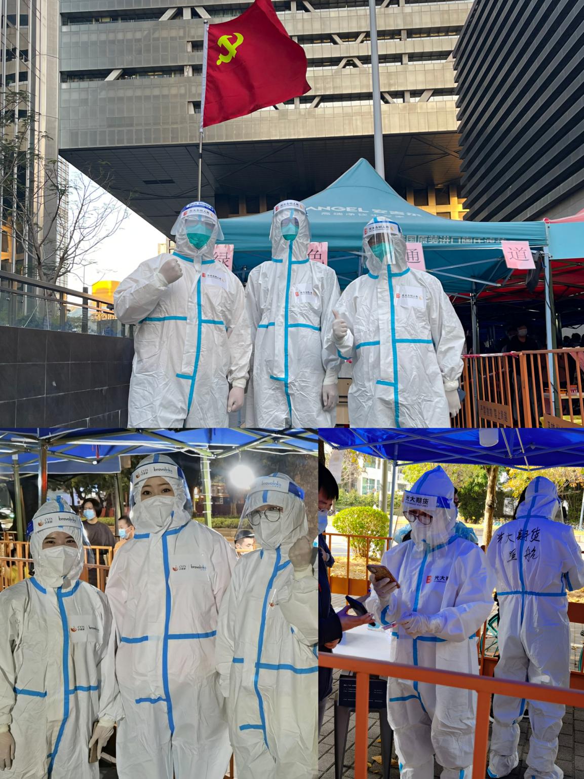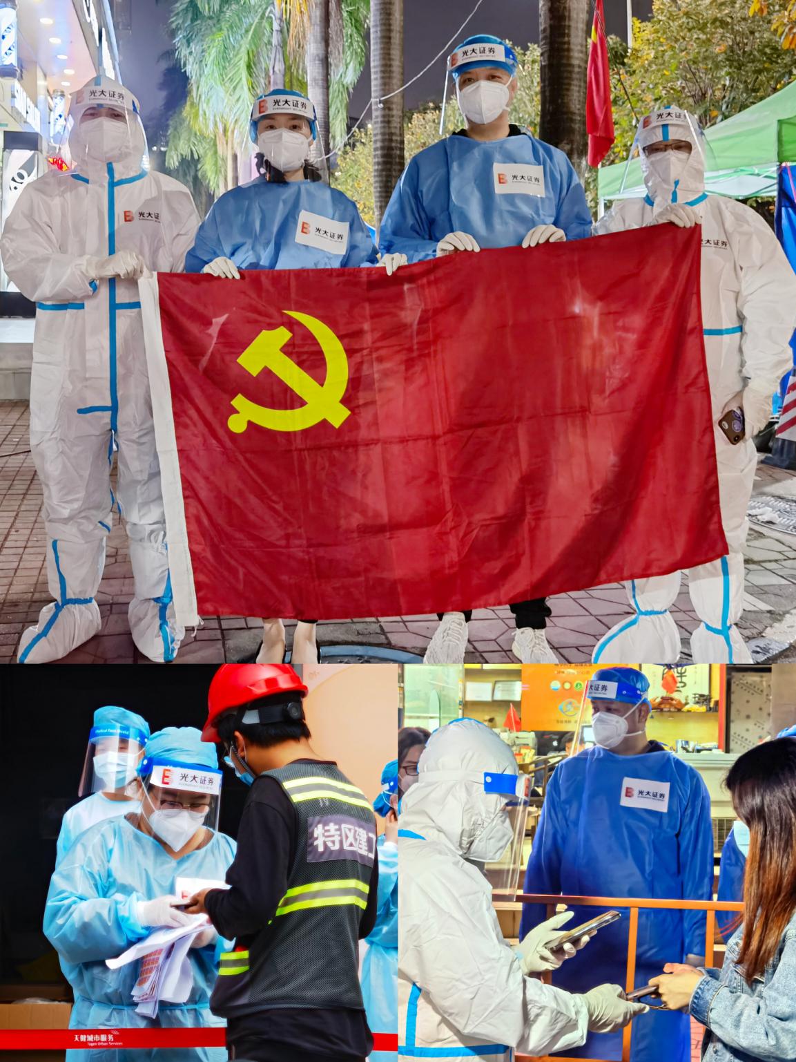 光大證券深圳分公司發(fā)揮基層黨組織戰(zhàn)斗堡壘作用和黨員先鋒模范作用,黨員干部迅速牽頭組建了“光證深分先鋒隊”,下沉基層抗疫一線,黨員同志們換上防護服、手套和隔離面罩深入蓮花街道多個社區(qū),全力協(xié)助醫(yī)護人員做好核酸檢測的輔助工作。從白天到黑夜的堅守,頂著溫差很大的深夜寒風,保持良好狀態(tài),為廣大群眾的身體健康安全提供了有力保障。一句句暖心的提示、一個個忙碌的身影,光大證券深圳分公司的志愿者們,用實際行動,堅定地守護著鵬城的人們!