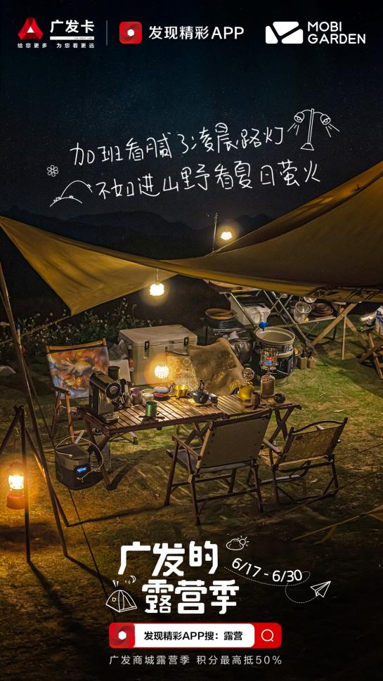 讀特客戶端?深圳新聞網(wǎng)2022年7月6日訊(記者 朱琳)一頂帳篷、一片草地、一桌餐品,呼吸戶外新鮮空氣放松身心……露營逐漸成為年輕人的戶外休閑方式。對(duì)此,廣發(fā)信用卡繼推出國內(nèi)首個(gè)沉浸式夜宿露營發(fā)布會(huì)之后,近日又以露營主題切入新世代年輕人的需求點(diǎn),布局戶外露營場景,上線為期兩月的“廣發(fā)的露營季”主題活動(dòng),在提倡城市生活“慢下來,去感受”理念的同時(shí),也釋放了一大波戶外露營標(biāo)配商品的折扣福利干貨。