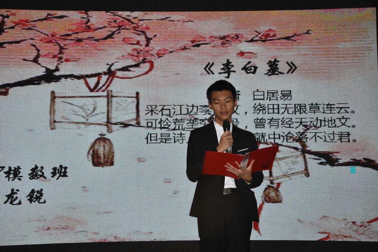 深圳新聞網(wǎng)訊 5月29日晚上,“新時代中華優(yōu)秀傳統(tǒng)文化進社區(qū)”項目第五場活動——“白居易詩歌專場朗誦大賽”在深圳市寶山技工學校寶山大舞臺拉開了帷幕,由寶山學子傾情吟誦白居易的詩歌,給聽眾帶來一場唯美動人的視聽盛宴。