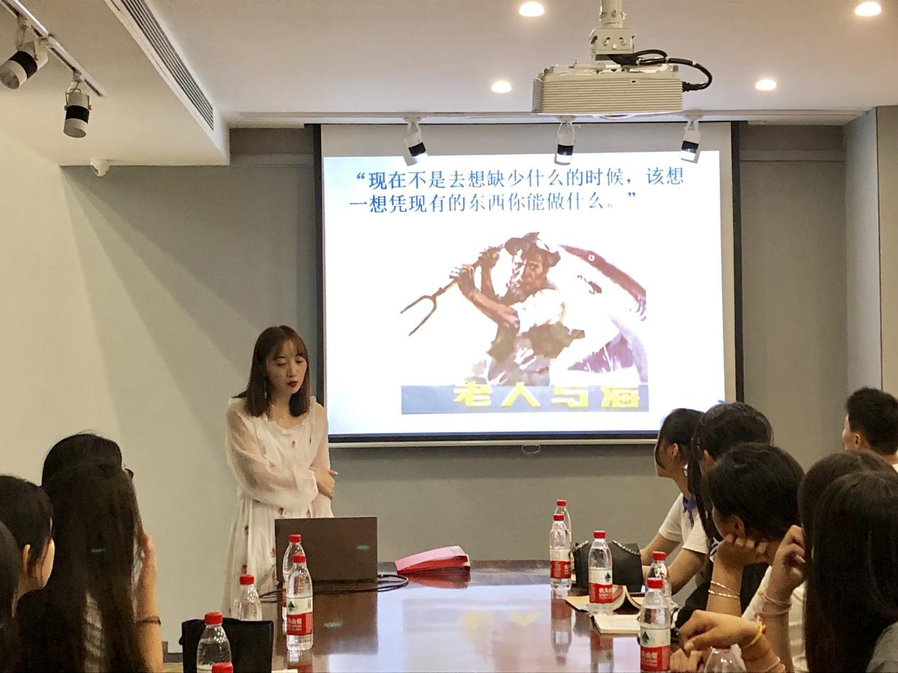 《老人與海》通過講述一個老漁夫的故事,揭示了人類共同的命運(yùn),給讀者帶來關(guān)于勇氣、不屈不撓、與命運(yùn)作斗爭的精神啟迪。圍繞“生而為人,請務(wù)必戰(zhàn)斗到底”這一主題,邵洋提出了“是選擇放棄,還是一往直前?”這一問題,引起在座同學(xué)的思考。隨后,她又通過解讀《老人與?!分械挠飨笈c藝術(shù)、生命與理想,為同學(xué)們總結(jié)值得學(xué)習(xí)的寫作思路。