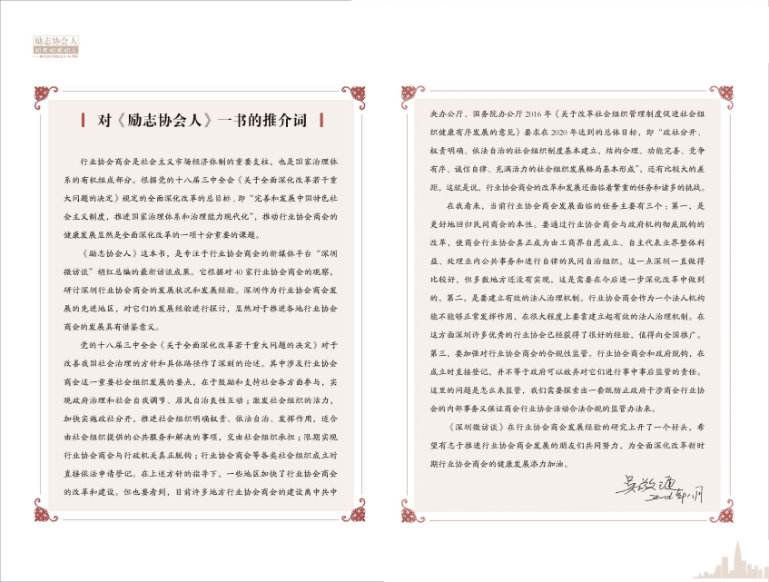 在《勵(lì)志協(xié)會(huì)人》40年40家40人的編著過(guò)程中,得到社會(huì)各界的關(guān)注、支持和高度肯定, 著名的經(jīng)濟(jì)學(xué)家吳敬璉說(shuō)《勵(lì)志協(xié)會(huì)人》研討了深圳行業(yè)協(xié)會(huì)商會(huì)的發(fā)展?fàn)顩r和發(fā)展經(jīng)驗(yàn)。深圳微訪談在行業(yè)協(xié)會(huì)商會(huì)發(fā)展經(jīng)驗(yàn)的研究上開(kāi)了一個(gè)好頭,希望有志于推進(jìn)行業(yè)協(xié)會(huì)商會(huì)發(fā)展的朋友們共同努力,為全面深化改革新時(shí)期行業(yè)協(xié)會(huì)商會(huì)的健康發(fā)展添力加油。