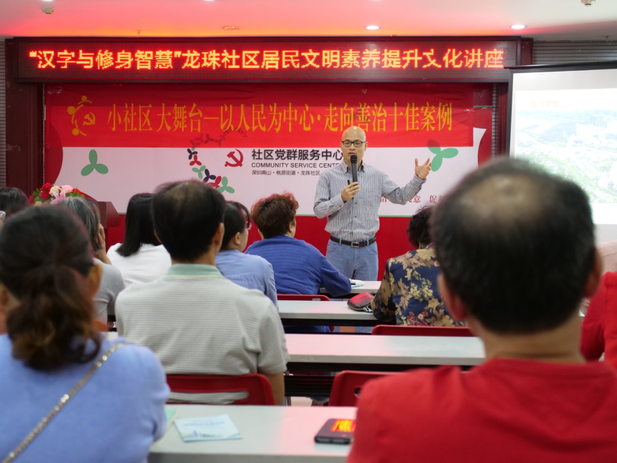 深圳新聞網(wǎng)訊 為更好地創(chuàng)建第六屆全國文明城市,以創(chuàng)新的活動形式提升社區(qū)居民的文明素養(yǎng),11月15日上午,龍珠社區(qū)舉行了“‘漢字與修身智慧’社區(qū)居民文明素養(yǎng)提升”專題文化講座,邀請壹讀書會創(chuàng)始人、知名閱讀推廣人、《漢字與修身智慧》的作者劉建彪擔(dān)任主講嘉賓,從中華文明的基因(漢字)出發(fā),解讀深圳市民公約,旨在啟發(fā)居民在中華優(yōu)秀傳統(tǒng)文化的感召之下,踐行文明禮儀,用實際行動去推進(jìn)文明城市的創(chuàng)建。