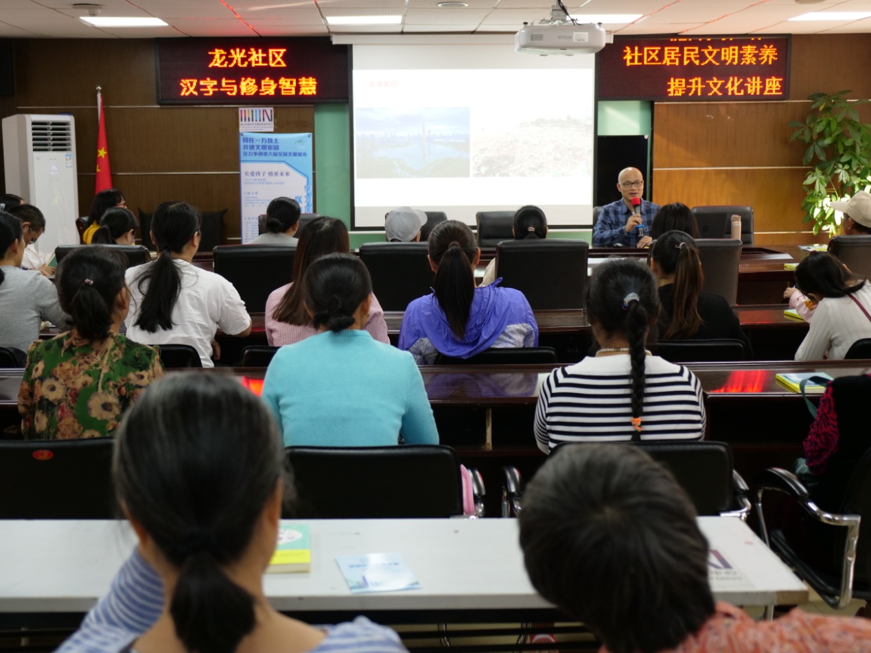 深圳新聞網(wǎng)訊 為更一步提升社區(qū)居民文化素養(yǎng),推動(dòng)社區(qū)創(chuàng)建第六屆全國(guó)文明城市工作邁上新的臺(tái)階,11月19日下午,龍光社區(qū)工作站組織社區(qū)居民參加“‘漢字與修身智慧’社區(qū)居民文明素養(yǎng)提升”文化講座,邀請(qǐng)壹讀書(shū)會(huì)創(chuàng)始人、知名閱讀推廣人、《漢字與修身智慧》的作者劉建彪擔(dān)任主講嘉賓,從中華文明的基因(漢字)出發(fā),解讀深圳市民公約,旨在啟發(fā)居民在中華優(yōu)秀傳統(tǒng)文化的感召之下,踐行文明禮儀,用實(shí)際行動(dòng)去推進(jìn)文明城市的創(chuàng)建。
