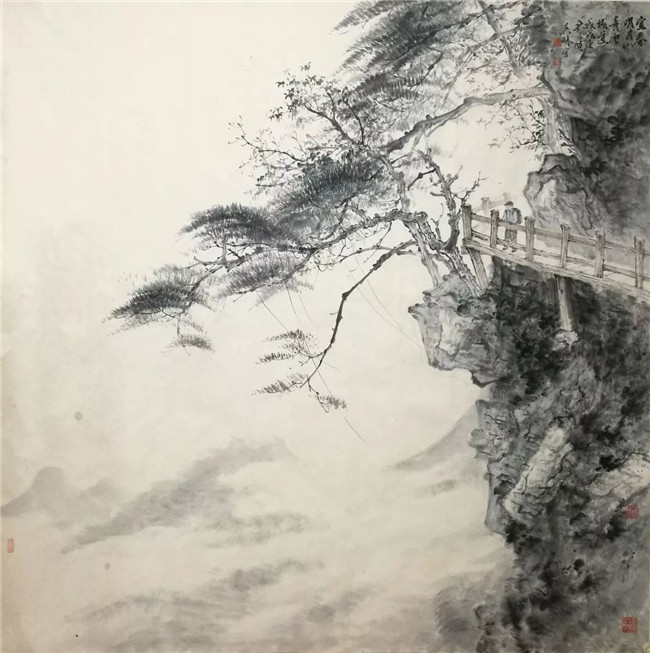 巨幅山水《江西明月山青云棧道》125*125cm
