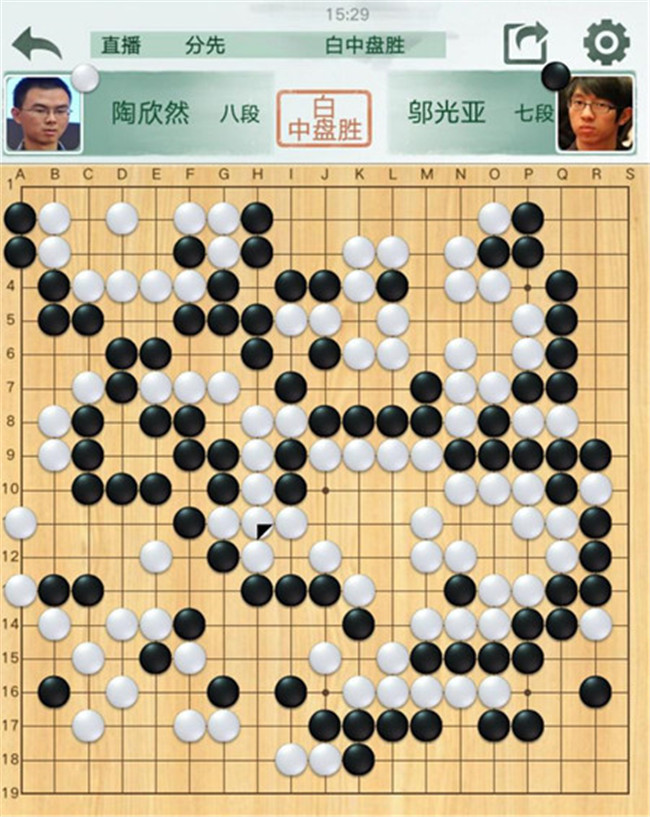 陶欣然執(zhí)白對陣鄔光亞。黑棋右邊攻擊白棋時候,連續(xù)失誤,反被白棋妙手吃通棋筋,黑已無法逆轉(zhuǎn)局面。有意思的是,賽前陶欣然遲到2分鐘被罰2分鐘,但絲毫不影響他獲勝。