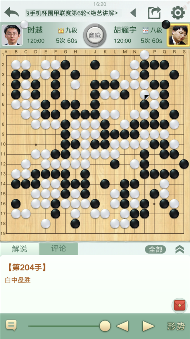 第四臺,時(shí)越執(zhí)白對陣胡耀宇。在前幾盤不盡人意的情況下,壓力較大。