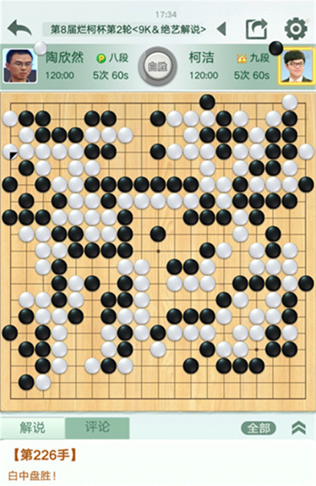 本局陶欣然執(zhí)白后行,以極具觀賞性的大模樣開局,將局面導(dǎo)向他擅長的進(jìn)攻節(jié)奏。在中腹的作戰(zhàn)中,白方判斷精準(zhǔn),棋感敏銳,保持了很高的AI吻合度,一直良好地把握著局面。行至后半盤,黑方柯潔開始了他擅長的逆風(fēng)攪局,多處挑起劫爭。好在陶欣然未出大錯,在混亂的局面下穩(wěn)住了局勢,保持優(yōu)勢直至226手黑方投子認(rèn)負(fù)。