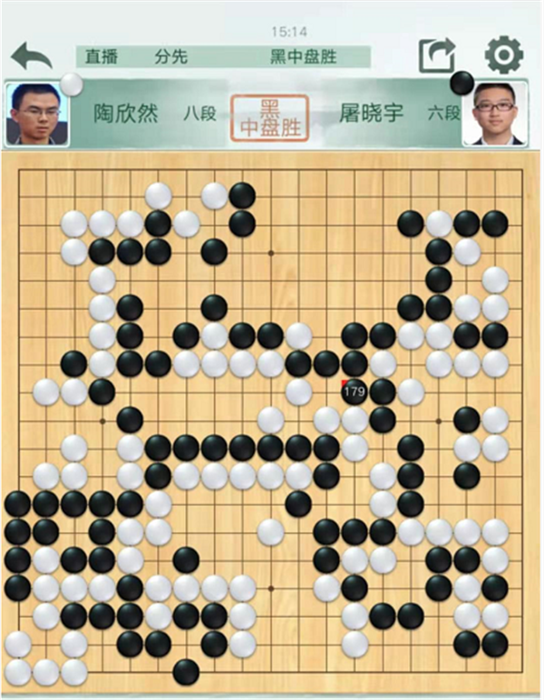第三臺,陶欣然執(zhí)白負(fù)屠曉宇。開局左下角形成流行的大型變化,結(jié)果大致兩分局面。右上角黑棋103行棋次序失誤,但是白棋106沒有把握住在黑空里面斷一個出棋的好機(jī)會之后,黑稍好。白中央114與黑互相破空急躁,導(dǎo)致局面惡化。最終白棋破釜沉舟選擇舍棄中央殺黑右下角,轉(zhuǎn)換后依然白棋敗勢遂認(rèn)負(fù)。