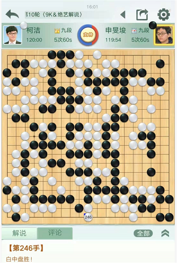 第二臺,主將臺,韓國等級分第三位的申旻俊主將執(zhí)黑對陣世界第一人柯潔。左下作戰(zhàn)黑略有所得。緊接著黑下邊行棋過分白棋抓住機(jī)會反擊后白稍好。之后左邊戰(zhàn)斗白棋下出緩手局面接近。左上白102試圖先手便宜時機(jī)不對,黑棋機(jī)敏棄去左上后又是黑棋領(lǐng)先。復(fù)雜的中央戰(zhàn)斗中白棋形狀處理不佳,導(dǎo)致巨龍成為打劫。白214找劫材時候黑應(yīng)劫敗招,消劫則黑勝勢。最終黑棋下方劫材過小,白棋消劫做活后白勝。