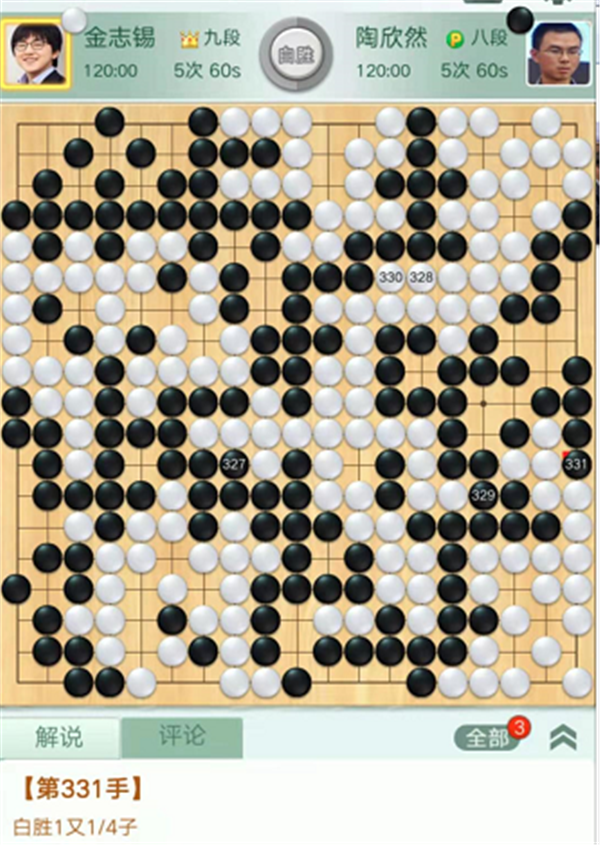 第二臺主將臺,由深圳隊(duì)陶欣然八段執(zhí)黑對陣衢州隊(duì)韓國外援、世界冠軍金志錫九段。開局下方戰(zhàn)斗雙方各有失誤,局面依然均勢。之后左上角形成打劫,白棋棄劫右上打穿黑空各有所得。黑棋攻擊左上角白棋時候白棋應(yīng)對失誤,黑棋取得領(lǐng)先。白棋看到形勢不利放出勝負(fù)手,打入上邊黑空過分,黑棋反擊后白棋極其危險。關(guān)鍵時候黑棋鼠標(biāo)點(diǎn)錯,給自己留下一個斷點(diǎn),被白棋活出后,局面難以挽回,陶欣然執(zhí)黑1又1/4子負(fù)金志錫。