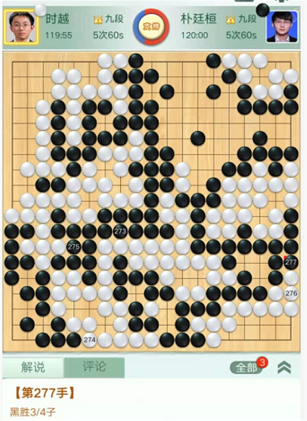 第二臺(tái)主將,由深圳隊(duì)時(shí)越九段執(zhí)白對(duì)陣成都隊(duì)韓國(guó)世界冠軍樸廷桓九段。開局下方雙方各有小失誤,局面均勢(shì)。之后左上黑棋行棋過分,白棋領(lǐng)先。白棋在黑右上角破空形成打劫,黑棋連走兩手分開右邊白棋進(jìn)行攻擊。白棋治孤中錯(cuò)失簡(jiǎn)明獲勝的下法,但是活出后依然稍好。緊接著白棋沒有選擇最大的官子,被黑棋走到后黑棋領(lǐng)先。之后黑棋官子收束滴水不漏,以最小差距3/4獲勝。時(shí)越執(zhí)白3/4子負(fù)樸廷桓。