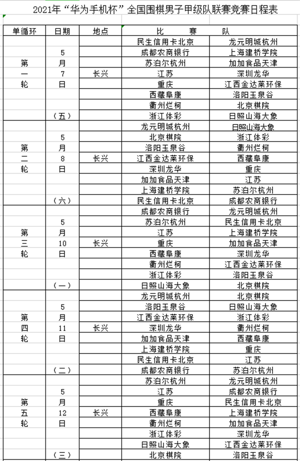 見(jiàn)圳客戶(hù)端深圳新聞網(wǎng)2021年5月6日訊(記者 周錦春)2021華為手機(jī)杯中國(guó)圍棋甲級(jí)聯(lián)賽今天在浙江長(zhǎng)興拉開(kāi)帷幕,首輪比賽將在5月7日進(jìn)行。根據(jù)4月22日在中國(guó)棋院舉行的抽簽結(jié)果,次日首輪比賽對(duì)陣形勢(shì)如下:深圳龍華隊(duì)將對(duì)陣江蘇隊(duì);衛(wèi)冕冠軍江西隊(duì)對(duì)陣重慶隊(duì);上屆亞軍日照隊(duì)對(duì)陣浙江隊(duì)。