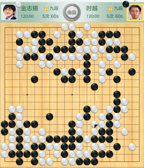 緊接著,時越執(zhí)黑對陣金志錫一局傳來告負的消息。縱觀全局,開局時黑稍好,但中盤攻擊上邊白棋時候方向錯誤,被白棋聯(lián)絡(luò)后自身還留下了白棋開劫的隱患。之后黑棋在劫爭中放棄上方黑子在下邊圍出大模樣爭勝。白棋在黑勢中施展手段時黑棋必需尋求凈殺白子。無奈周邊不夠厚實殺不掉,遂于174手時認負。