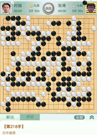 時越快棋執(zhí)白對陣張濤。右邊作戰(zhàn)時候,黑棋沒有選擇造劫劫爭而是退讓,被白將右邊幾子吃掉后又吃掉右上黑棋,黑棋局面落后。之后黑棋右下又死活看錯被白先手活出,導(dǎo)致雪上加霜,實(shí)際上棋局已經(jīng)結(jié)束。