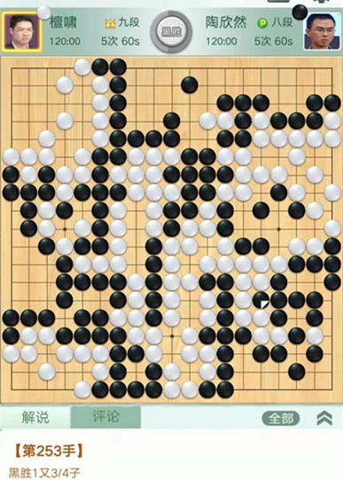 陶欣然執(zhí)黑對陣檀嘯。中盤白棋在右邊下出緩手,導(dǎo)致攻守逆轉(zhuǎn),白棋被迫做劫求活。黑棋利用劫爭中央連走兩手獲利巨大。之后黑棋穩(wěn)健收官將優(yōu)勢保持至終局。