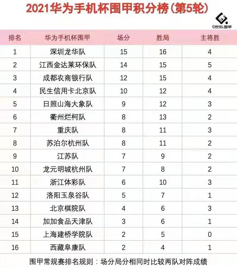 第五輪各隊(duì)?wèi)?zhàn)況如下:衢州爛柯4比0勝加加食品天津;浙江體彩隊(duì)1:3深圳龍華隊(duì);日照山海大象隊(duì)1:3江西金達(dá)萊環(huán)保隊(duì);重慶隊(duì)3比1民生信用卡北京隊(duì);成都農(nóng)商銀行隊(duì)3:1勝江蘇隊(duì);西藏阜康2:2主將勝上海建橋?qū)W院;北京棋院隊(duì)2:2主將勝洛陽玉泉谷隊(duì);蘇泊爾杭州2:2主將負(fù)龍?jiān)鞒呛贾?。第一階段結(jié)束,深圳龍華隊(duì)五戰(zhàn)全勝積15分居“魁首”,江西金達(dá)萊環(huán)保隊(duì)僅以一分之差緊隨其后,成都農(nóng)商銀行隊(duì)積12分居第三位。