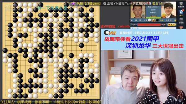 今日大局好,教練羅洗河心情自然好。于是興高采烈地去虎牙直播和戰(zhàn)鷹侃棋了。戰(zhàn)鷹是職業(yè)二段,女子圍甲主力選手,人美、棋強、口才好,虎牙直播間圍棋知名主播,是深圳龍華隊網(wǎng)上直播合作人。深圳龍華隊后續(xù)比賽將持續(xù)在虎牙平臺直播,歡迎大家關(guān)注哦!