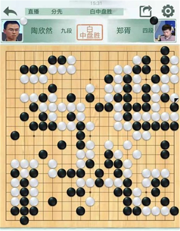 陶欣然執(zhí)白對陣小將鄭胥。黑棋開局在左邊虧損,局面落后。最后黑棋在右邊破釜沉舟尋求戰(zhàn)機,白棋計算精準(zhǔn),將黑全殺,白中盤勝。