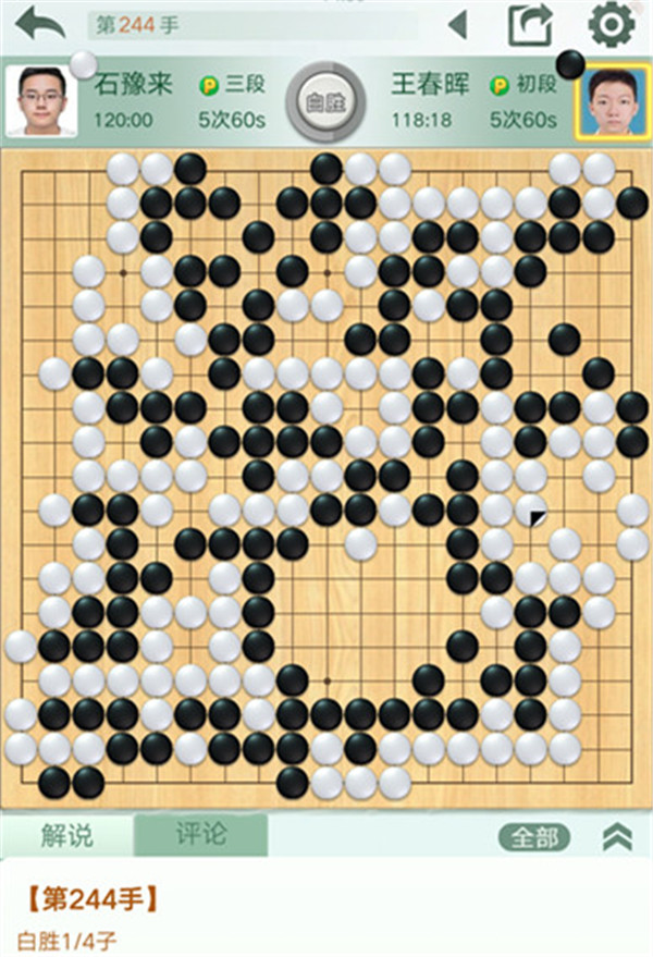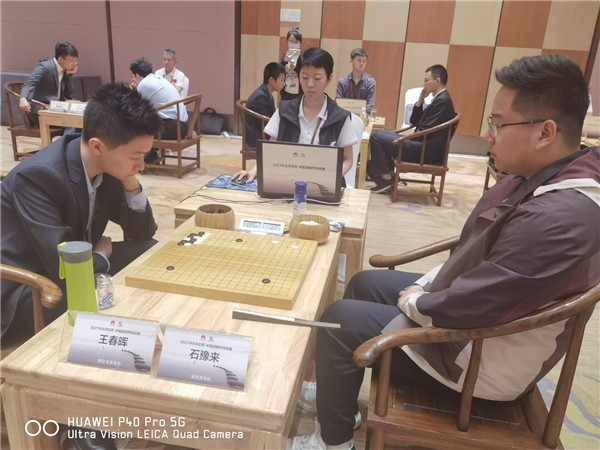石豫來執(zhí)白對陣小將王春暉。雙方錯(cuò)進(jìn)錯(cuò)出,最終黑棋小官子出現(xiàn)問題,白棋幸運(yùn)1/4子獲勝。