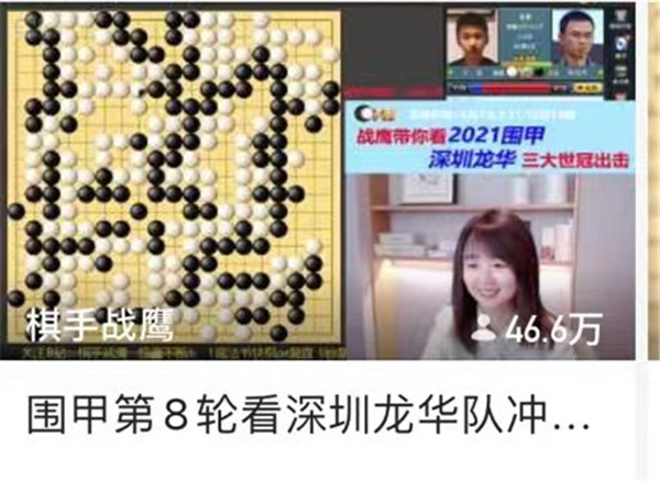 形勢大好,深圳龍華隊(duì)網(wǎng)上直播合作人,虎牙直播間圍棋知名主播戰(zhàn)鷹這里自然也是“門庭若市”,人數(shù)沖上46萬大關(guān)。賽后,石豫來到直播間作客,小帥哥自然受到熱捧!深圳龍華隊(duì)的后續(xù)戰(zhàn)況仍將在這里直播哦,關(guān)注戰(zhàn)鷹講棋,人美、棋強(qiáng)、口才好,是知名的圍棋主播。