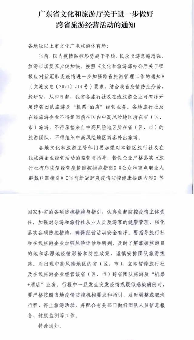 深圳新聞網(wǎng)2021年8月25日訊 (記者 田志強(qiáng))廣東省文化和旅游廳今日發(fā)布《關(guān)于進(jìn)一步做好跨省旅游經(jīng)營活動(dòng)的通知》,通知明確:從即日起,我省各旅行社及在線旅游企業(yè)可有序開展跨省團(tuán)隊(duì)旅游及“機(jī)票+酒店”經(jīng)營業(yè)務(wù)。各地旅行社及在線旅游企業(yè)不得組團(tuán)前往國內(nèi)中高風(fēng)險(xiǎn)地區(qū)所在省(區(qū)、市)旅游,不得承接來自中高風(fēng)險(xiǎn)地區(qū)所在?。▍^(qū)、市)的旅游團(tuán)隊(duì),不得組織中高風(fēng)險(xiǎn)地區(qū)游客外出旅游。