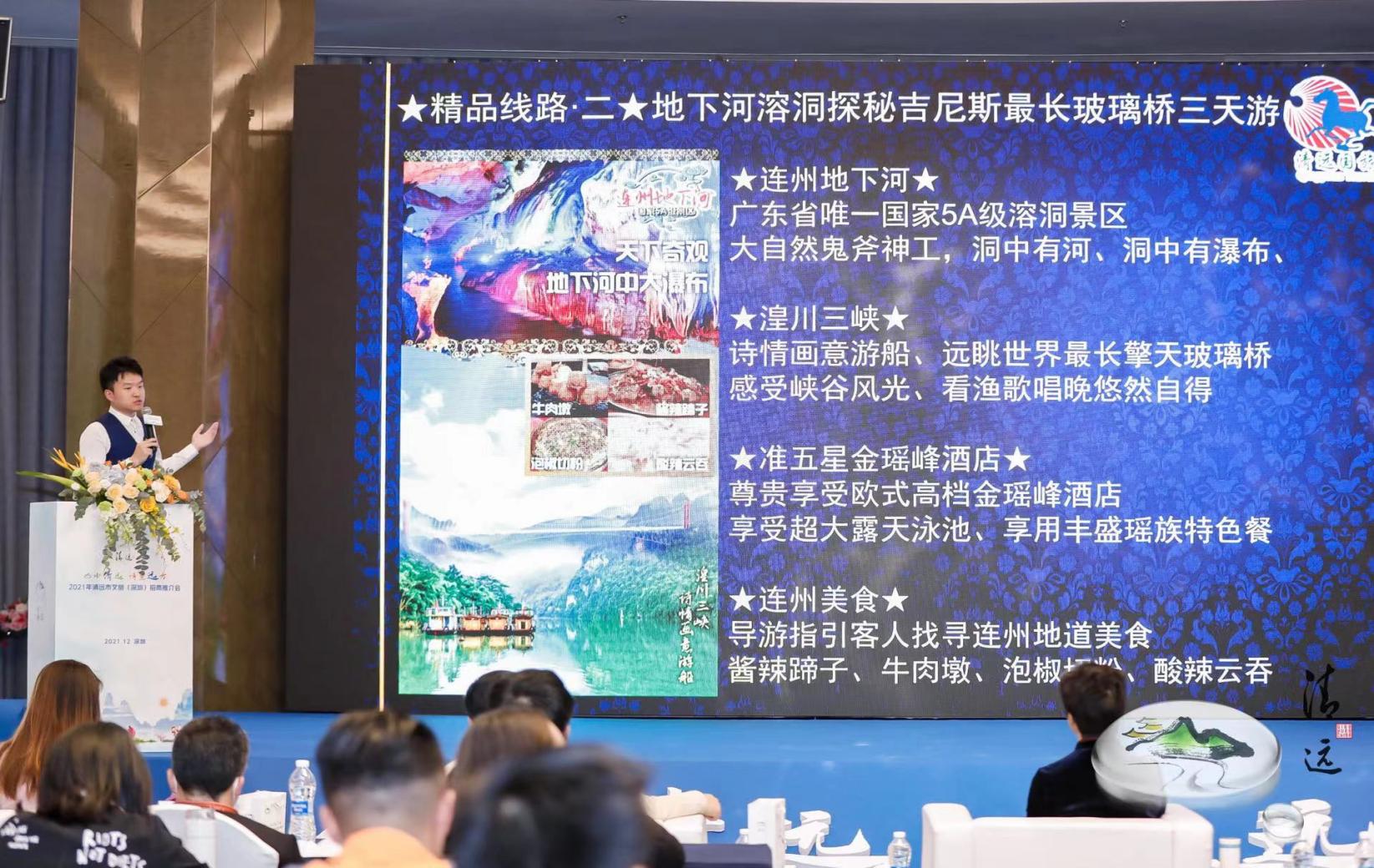 文化是旅游的靈魂,旅游是文化的載體。近年來,清遠依托自然資源稟賦和深厚的文化底蘊,多措并舉推動文旅融合發(fā)展,文旅產(chǎn)業(yè)呈現(xiàn)欣欣向榮局面。現(xiàn)場,清遠市珠水美悅酒店管理有限公司總經(jīng)理宋玉亮、清遠市古龍峽生態(tài)旅游娛樂有限公司營銷專員林嘉儀、清遠市愛地旅游發(fā)展有限公司營銷經(jīng)理楊舒浩、清遠市國業(yè)旅游開發(fā)有限公司常務(wù)副總經(jīng)理韓勇,依次以圖文并茂、聲畫結(jié)合的形式,推介了美林湖景區(qū),古龍峽景區(qū),連州地下河、湟川三峽、龍?zhí)犊蜅?、擎天玻璃橋、連州大酒店,峰林曉鎮(zhèn)、洞天仙境,讓與會人員身臨其境感受山水清遠的魅力;清遠市國旅國際旅行社有限責(zé)任公司業(yè)務(wù)總監(jiān)李國華則現(xiàn)場推介了古龍峽云天玻霸兩天游、地下河溶洞探秘及吉尼斯最長玻璃橋三天游等5條精品旅游線路,現(xiàn)場“種草”清遠眾多網(wǎng)紅打卡點。