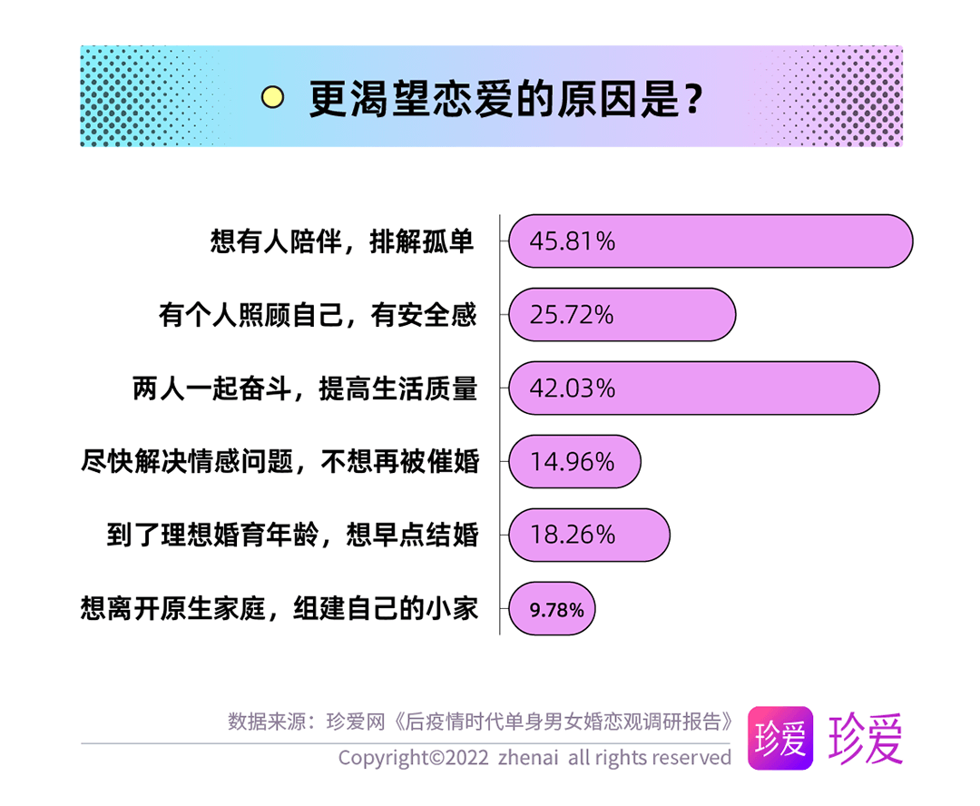 對(duì)于不同年齡段受訪者的分析發(fā)現(xiàn),30歲以上的用戶更注重愛(ài)情的感性價(jià)值,脫單首要原因是想要享受愛(ài)情、體驗(yàn)愛(ài)與被愛(ài);20-30歲的單身青年們則更希望找到一位與自己共同奮斗的伴侶,提升生活質(zhì)量。
