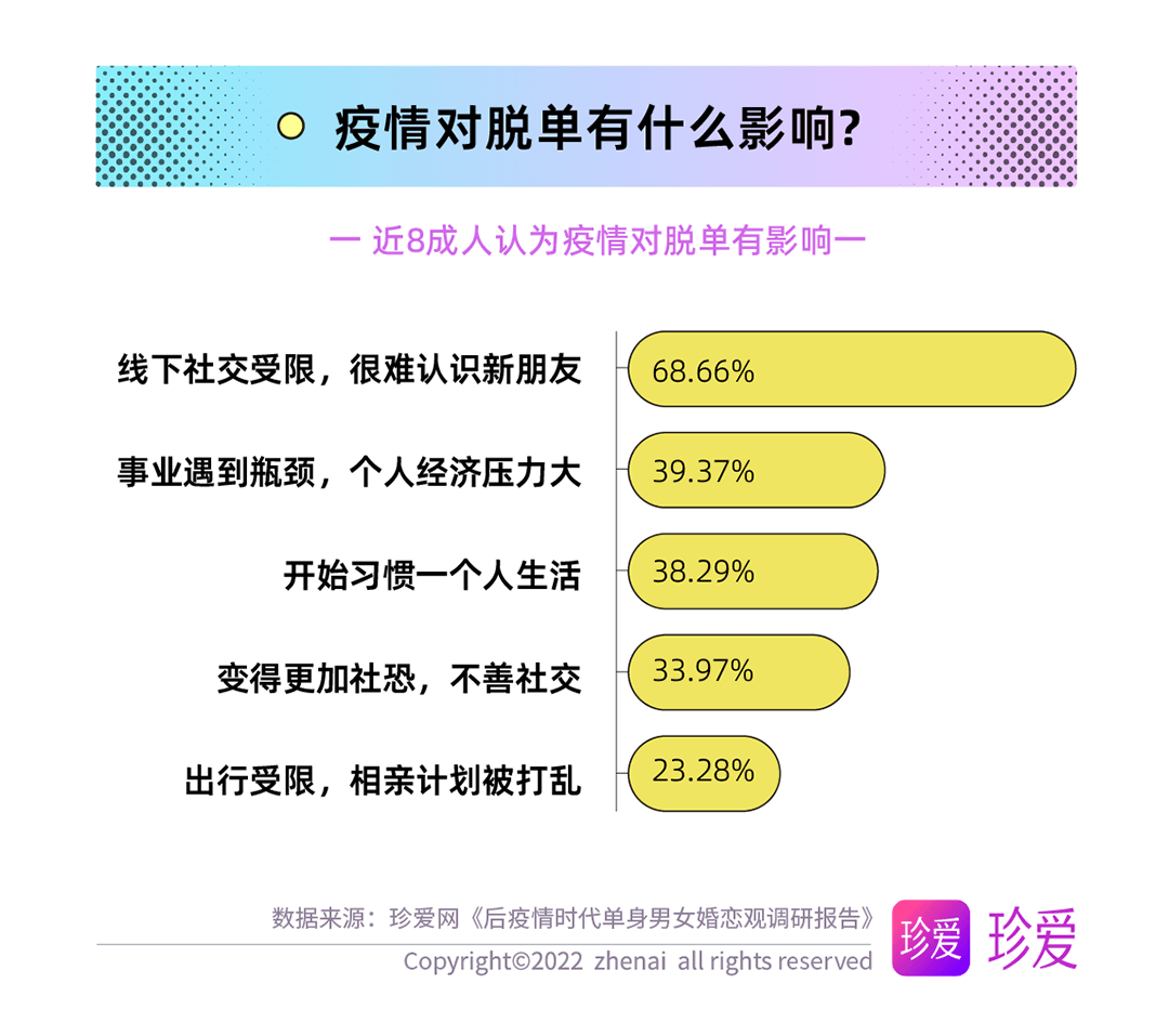 多數(shù)人都更渴望愛(ài)情,但疫情也對(duì)脫單進(jìn)程產(chǎn)生了一定影響。報(bào)告顯示,近八成人認(rèn)為疫情對(duì)脫單有影響,其中首要影響為線下社交減少導(dǎo)致很難認(rèn)識(shí)新朋友(68.66%),其次為日常出行受限因此相親計(jì)劃被打亂(39.37%),此外還有開(kāi)始習(xí)慣一個(gè)人生活、事業(yè)遇到瓶頸導(dǎo)致的個(gè)人經(jīng)濟(jì)壓力大、更加“社恐”等影響。