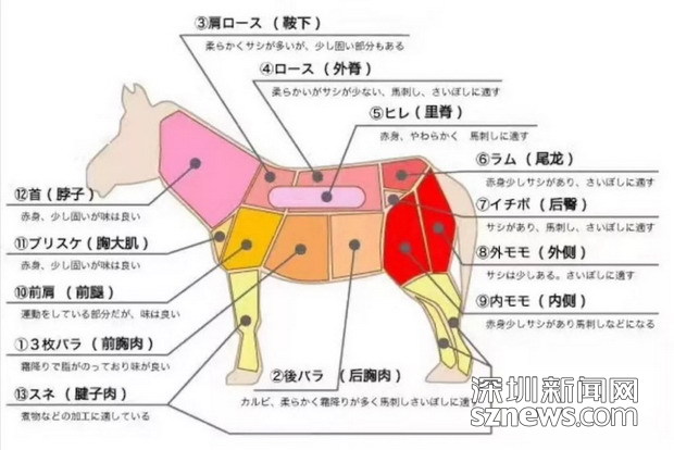 馬能做成刺身的部位相當(dāng)?shù)挠邢?,依照油花分布大致可以分為腹?卜口)、霜降、赤身等不同的等級。其中最稀有的的“三枚腹”肉,一匹五百公斤的馬只能產(chǎn)出大約5-6公斤,肉質(zhì)口感近似于藍(lán)鰭金槍魚中腹肉。